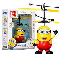 هذه الصورة تُظهر لعبة طائرة مروحية كهربائية على شكل شخصية كرتونية شهيرة تُشبه الشخصيات الصفراء الصغيرة المعروفة. اللعبة مصممة بشكل مجسم، حيث تأخذ شكل شخصية ذات جسم أصفر مستدير، ترتدي نظارات دائرية رمادية اللون وسالوبات زرقاء. الشخصية تظهر بابتسامة عريضة تُضفي لمسة مرحة على التصميم، وترفع يدها اليمنى في إشارة ودية.